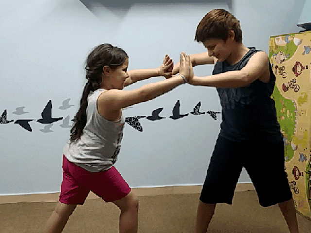 אופן ביצוע התרגיל: עומדים אחד מול השני, רגליים יציבות ומנסים לדחוף אחד את השני כאשר הכפות ידיים דוחפות את כפות הידיים של השותף לתרגיל.