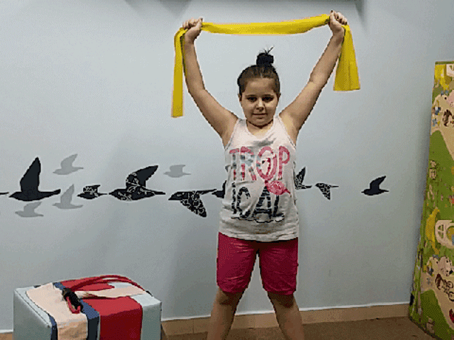אופן ביצוע התרגיל: בעמידה או בישיבה, ניתן לבצע באופן יחיד או בשיתוף פעולה עם כמה ילדים. למתוח לכיוונים מנוגדים, לכל צידי הגוף, מעל לראש ולפנים.